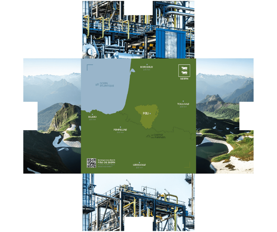 La carte en bonne place au verso permet de situer le territoire. Au recto, une première image convoque le Pyrénées. En s’ouvrant, elle fait entrevoir une réalité économique plus méconnue.